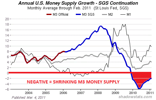 Fortunately, figures are still available for the individual components of M3. Here is a graphthat is worth a thousand words. It comes from ShadowStats.com (Shadow Government Statistics or SGS) and is reconstructed from the available data on those components. The red line is growth in the M3 money supply as reported by the Fed until 2006. The blue line is the growth in M3 after 2006.