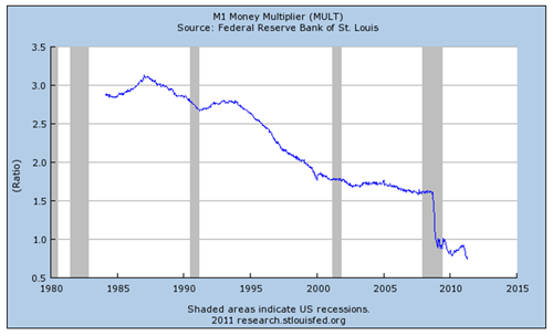 Here is another telling chart – the M1 Money Multiplier from the Federal Reserve Bank of St. Louis: