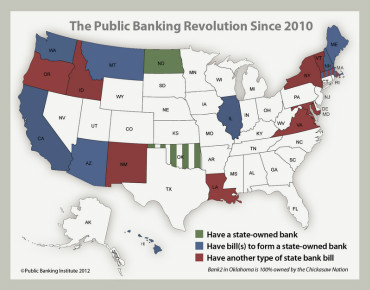 Seventeen states have now introduced bills for state-owned banks, and others are in the works. Hawaii’s innovative state bank bill addresses the foreclosure mess. County-owned banks are being proposed that would tackle the housing crisis by exercising the right of eminent domain on abandoned and foreclosed properties. Arizona has a bill that would do this for homeowners who are current in their payments but underwater, allowing them to refinance at fair market value. Continue reading →