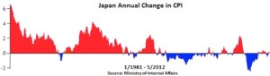 Some of the money for these government expenditures has come directly from “money printing” by the central bank, also known as “quantitative easing.”  For over a decade, the Bank of Japan has been engaged in this practice; yet the hyperinflation that deficit hawks said it would trigger has not occurred.  To the contrary, as noted by Wolf Richter in a May 9, 2012 article: