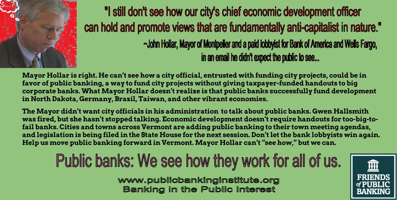 3. What else would one expect except a fulisade of lies to deceive the public. As per the Canadian postal service being in financial trouble and the proposition but forward of a postal bank being nixed as unfair competition for Canada’s equally corrupt banking giants. Competiton as a neccessary part of capitalism is considered sin by the corporate trusts when directed at them but full blown laissez faire capitalism delivered by these same hands is considered good for the citizenry. Why anyone in Vermont wouldn’t understand the duplicity in this man’s statement could be a test of minimal intelligence….