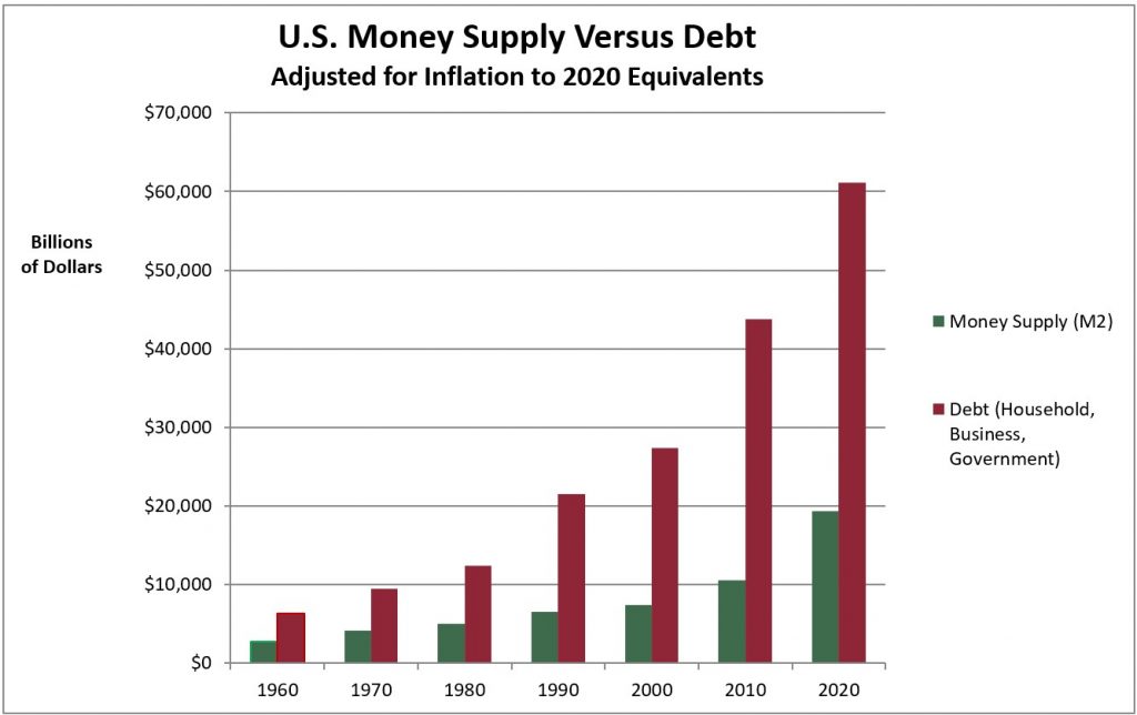 That sort of across-the-board debt forgiveness can’t be done today because most of the creditors are private lenders. Banks, landlords and pension fund investors would go bankrupt if their contractual rights to repayment were simply wiped out. But we do have a serious debt problem, and it is largely structural. Governments have delegated the power to create money to private banks, which create most of the circulating money supply as debt at interest. They create the principal but not the interest, so more money must be repaid than was created in the original loan. Debt thus grows faster than the money supply, as seen in the chart from WorkableEconomics.com below. Debt grows until it cannot be repaid, when the board is cleared by some form of market crash such as the 2008 financial crisis, typically widening the wealth gap on the way down.