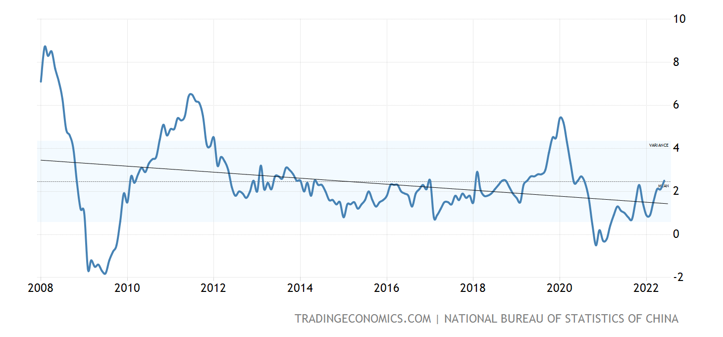 Yet all this stimulus has not driven up Chinese prices. In fact consumer prices initially fell in 2008 and have hovered around 2% ever since. [See chart below.]