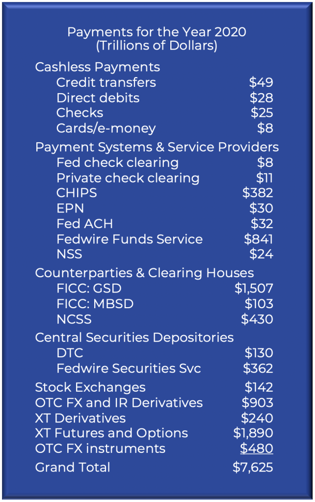 [i] Bank for International Settlements, https://stats.bis.org/statx/toc/CPMI.html (Data on cashless payments, payment systems, service providers, counterparties, clearing houses, and central security depositories. Click on the United States, https://www.bis.org/statistics/rpfx22.htm?m=2617 (Data on OTC FX and IR derivative), https://stats.bis.org/statx/srs/table/d1 (Data on XT futures and options), https://stats.bis.org/statx/srs/table/d11.2. (Data on OTC FX Instruments), Federal Reserve Bank of New York, https://www.newyorkfed.org/medialibrary/Microsites/fxc/files/2022/aprfxsurvey2022.pdf (Data on XT Derivatives), Cboe Global Markets, https://www.cboe.com/us/equities/market_statistics/historical_market_volume/ (Data on stock market volumes). All data is the latest available. Most categories are for 2020, some categories are for 2021 and 2022.